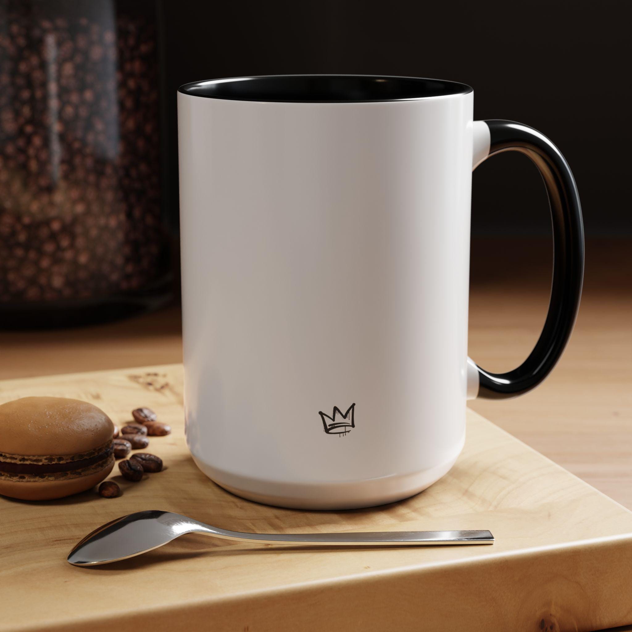 Printed on high-quality white ceramic with black handle and interior.
