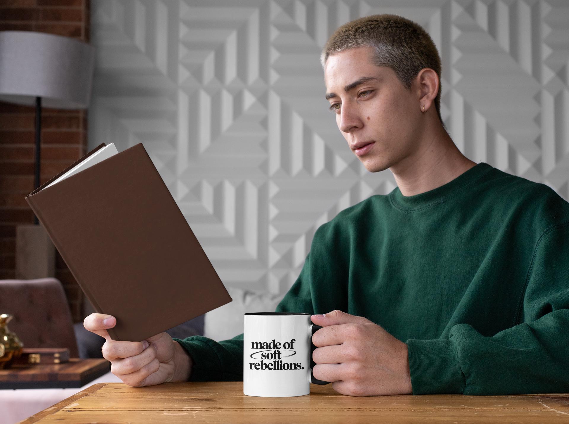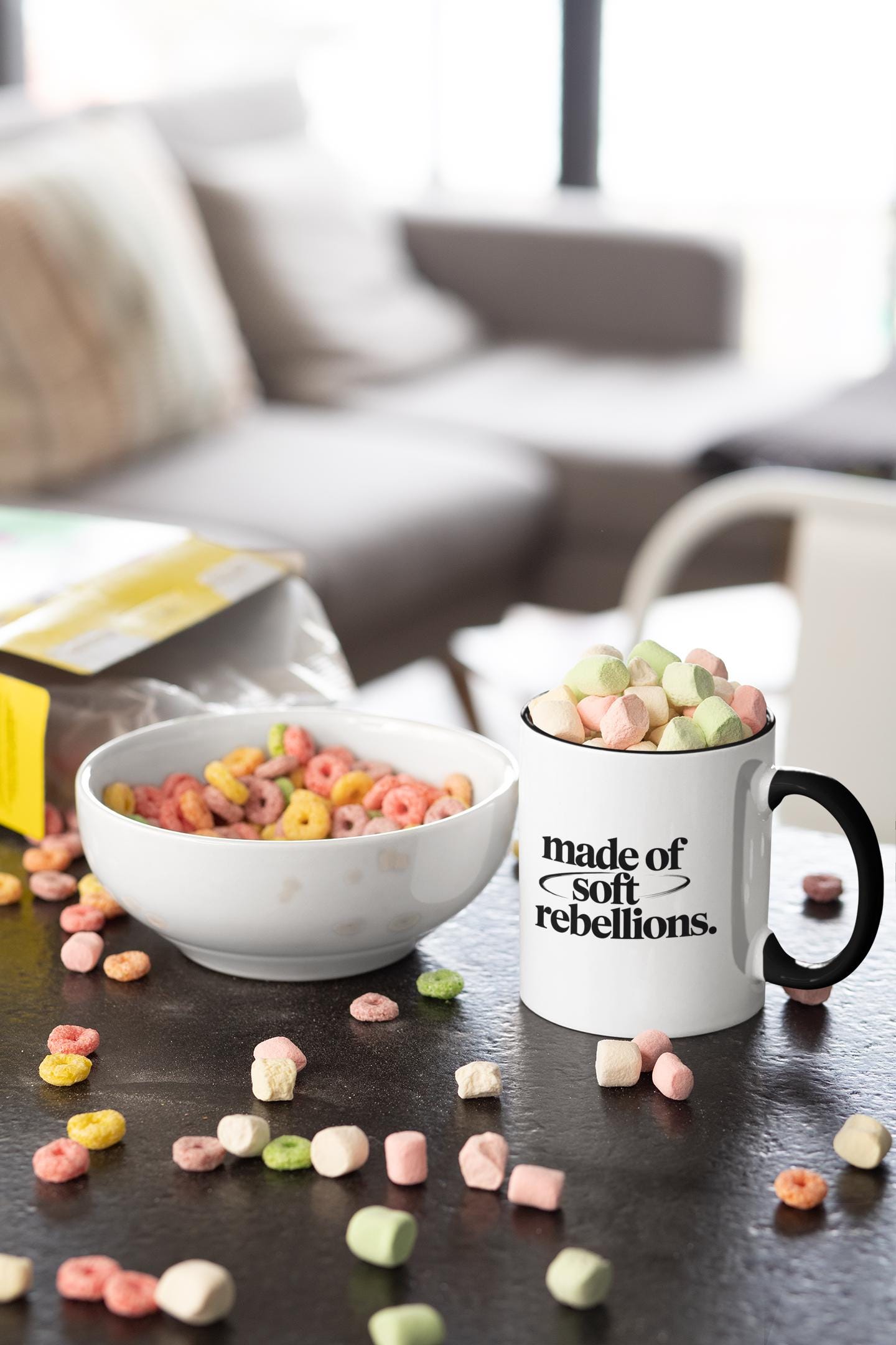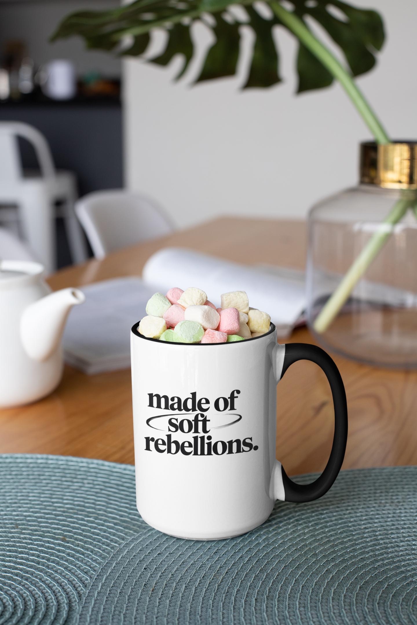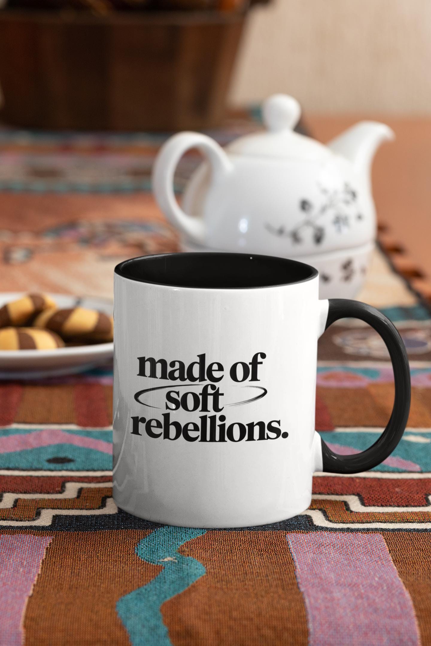 Made of Soft Rebellions – Minimalist Aesthetic Mug | Emotional Typography Coffee Cup | Modern Black & White Quiet Collection Mug