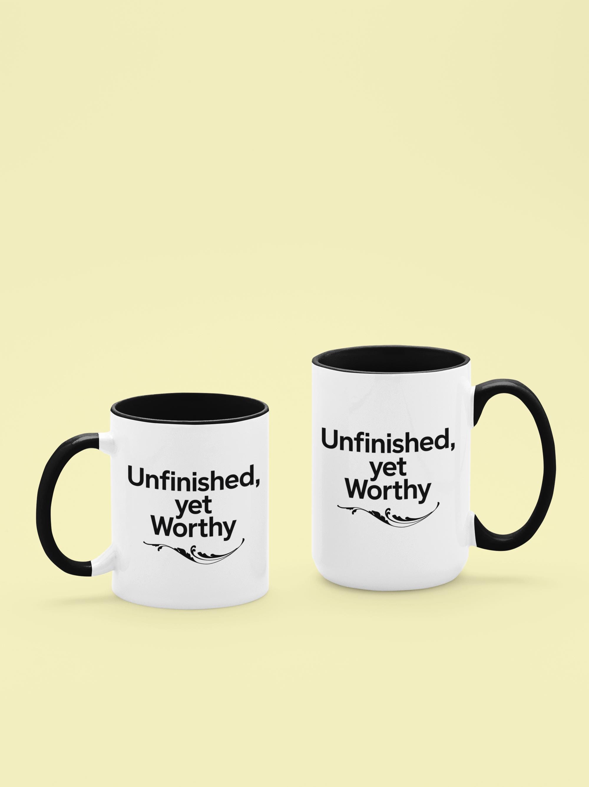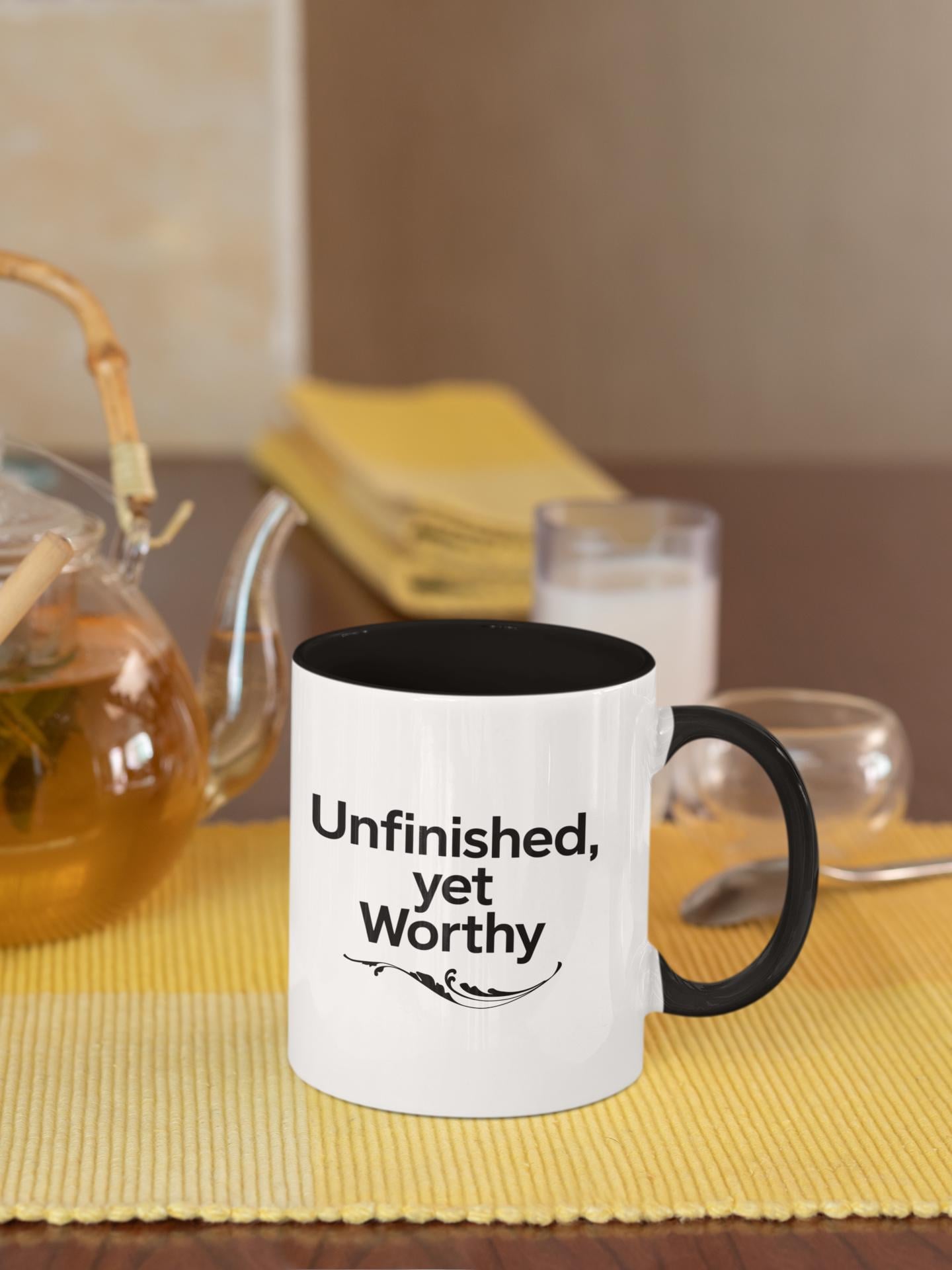 Unfinished Yet Worthy – Minimalist Quote Mug | Emotional Typography Coffee Cup | Black & White Aesthetic from The Quiet Collection
